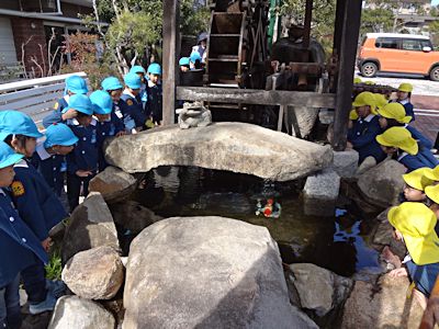 博物館のすぐ脇にある荒神社をお参りし、参道の水車小屋の鯉を見学し博物館内へ… 博物館の池の鯉は、お寺の鯉と兄弟姉妹でもある。