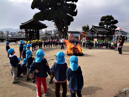 当園では、正月明けに‟とんど”を行っている。正月の飾り物を始め、子ども達が書いた書初めや絵を入れ、1年間の健康と幸せをお祈りするのである。職員が点火して次第に炎が大きくなると、子ども達のテンションも上がったくる。「わ~すごい!」「熱い~!」などと可愛らしい声が上がてくる。