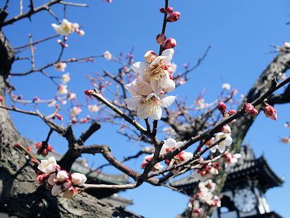 本堂前の梅の老木が花をつけだした。例年に比べ少し時期が早いような気もするが、立春を過ぎると草木も目覚めてくるのであろう。 雲一つない青い空がとても綺麗であった…