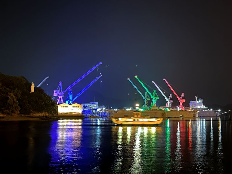 駅の向かいにあるドックがライトアップされており、その前をちょうど渡船が通ってとてもいい雰囲気でした。